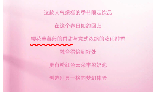 另一款“櫻花風味咖啡”宣傳具有“雙重治愈香氣——櫻花的柔和,沁人心脾;草莓的香甜,鼻尖縈繞;兩種芳香,美妙交織”;然而,產品配料表中同樣沒有任何與櫻花相關的內容。