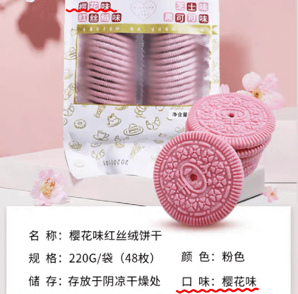 例如,一款櫻花風味的餅幹的配料表中有胭脂蟲紅、重瓣紅玫瑰速溶粉(重瓣紅玫瑰、麥芽糊精)等,它們是產品呈現櫻花淡粉色的重要成分;至於“櫻花味”,商傢特別標註“櫻花味感來自於配料中的食用香精香料”。