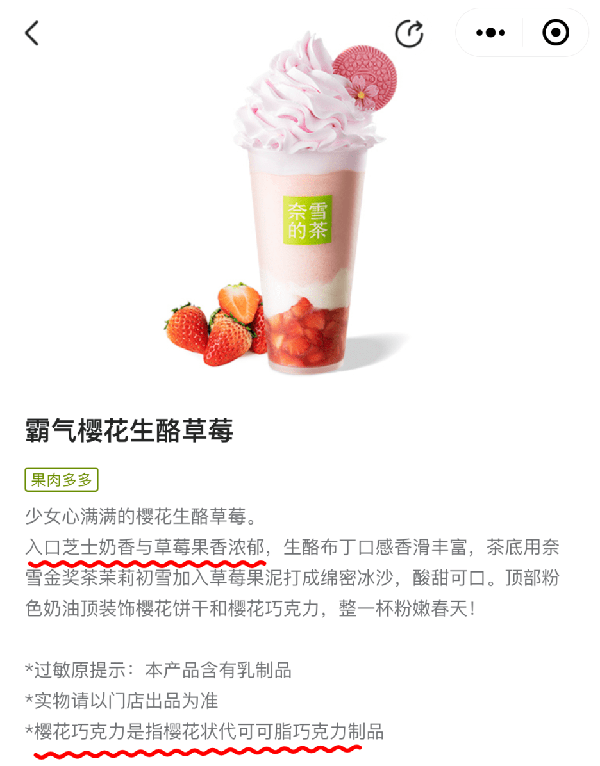 現制茶飲品牌“奈雪的茶”也推出瞭“霸氣櫻花生酪草莓”“櫻花生酪拿鐵”等季節飲品,在點單頁面,特別標註瞭“櫻花”的原料——粉色奶油、粉紅色的餅幹,以及櫻花形狀的代可可脂巧克力。