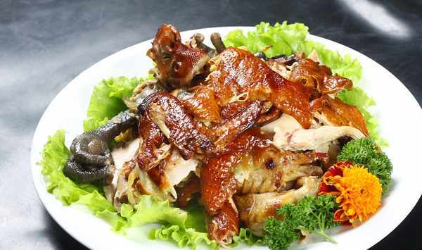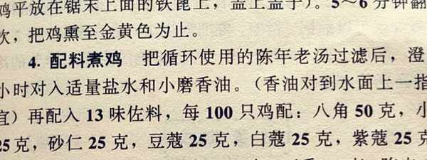 再配入13味佐料,每100只雞配:八角50克,小茴香25克,砂仁25克,豆蔻25克,白蔻25克,紫蔻25克,肉桂50克,良薑100克,草果100克,丁香25克,陳皮50克,白芷50克,山奈50克。然後,把熏好的雞放入鍋內,用鐵篦壓住雞身,使雞身完全浸泡在雞湯中。用大火把雞湯燒開後,立即停火,用餘火將雞燜煮3~6小時即可。