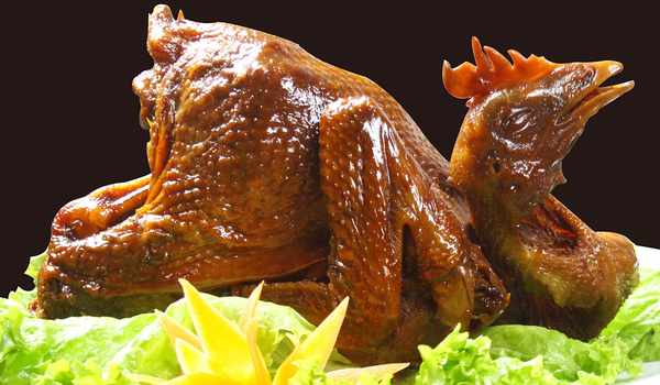 熏雞鍋內放有燃燒的鋸末,把雞平放在鋸末上面的鐵篦上,蓋上蓋子,5~6分鐘翻動一次,把雞熏至金黃色為止。