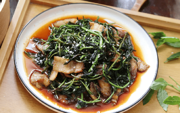 第一步:枸杞芽清洗幹凈,入鍋焯煮一分鐘,撈出捏凈水分切長段。五花肉也入鍋煮半小時,熟透後撈出切薄片備用。
