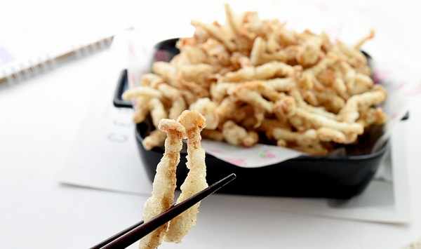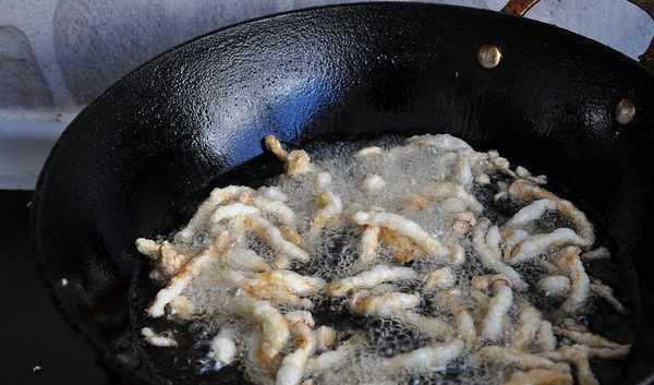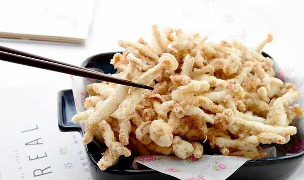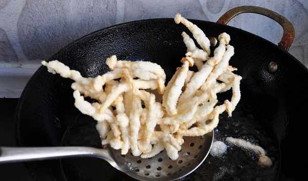6注意,菌菇剛下鍋時會有水分,油鍋會微微的有油濺出來,要小心。炸到這個表層微微發黃的程度,撈出,再把剩餘的全部炸完。這時,菌菇的外殼是脆的。