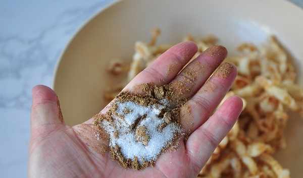 8將花椒粉和鹽調勻,撒在炸好的菌菇上即可。您也可以用自己炒制花椒鹽,更美味。