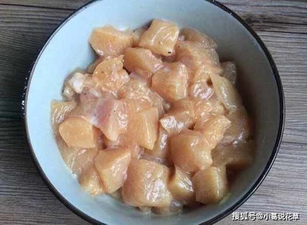 2、將準備好的雞胸肉洗凈切塊,放入碗中醃制,醃制時加入蠔油和糖,順時針方向攪拌醃制20分鐘,使雞肉醃制後更加柔軟。