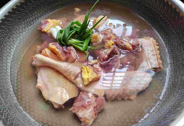 第二步:把鴨肉放入鍋中,加入一個蔥結和一半薑片,焯水10分鐘,撈起沖洗一遍,控幹水分備用。