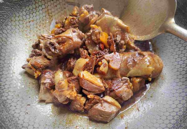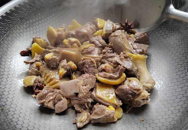 第三步:起鍋燒油,放入薑片和鴨肉爆炒一會兒,炒至鴨肉微黃的狀態,再加入桂皮、八角、香葉炒出香味。