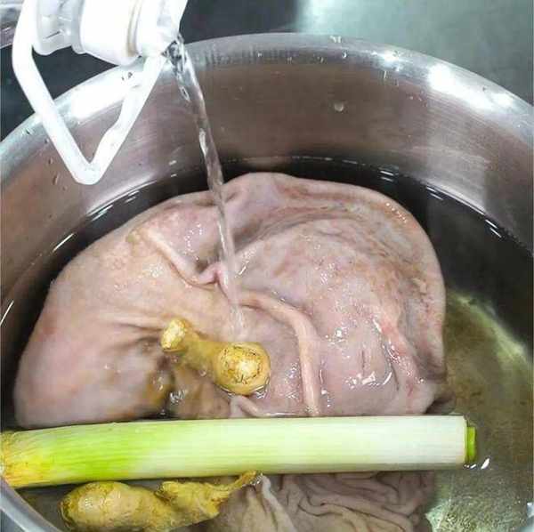 等待5分鐘進行簡單的醃制,然後我們在盆中倒入少量的清水,以能稍微淹沒豬肚為宜。