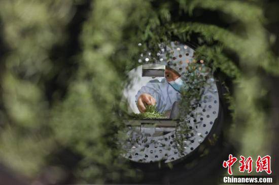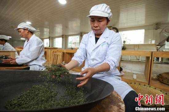 據史料記載,早在隋唐時期,雲霧茶曾為貢品供皇室宮廷品用,因此而得名“雲霧貢茶”。圖為4月2日晚,貴定縣雲霧鎮一傢茶葉加工坊工人在查看“雲霧貢茶”殺青情況。瞿宏倫 攝
