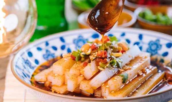 平時在傢涼拌的時候,基本上不適用菜刀切,他們都用專門的工具和盤子,然後加上各種調料,辣椒油、芥末油、醋等,就成瞭超級下飯的涼拌麻辣冰粉。如果喜歡吃甜一些的,加一勺蜂蜜就可以瞭。(芥末是很多涼拌菜中都會放的調料,2滴就會很刺鼻,吃不瞭這個味的可以不放)