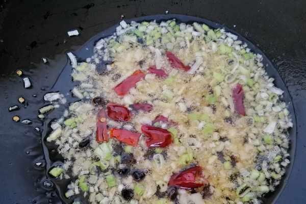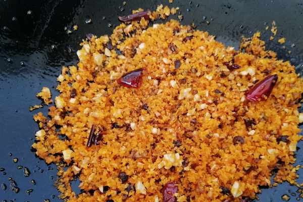 鍋裏留底油,放入葱薑蒜末和豆豉、辣椒炒香,一定要小火慢慢炒,蒜末變得焦黃時放入麵包糠。