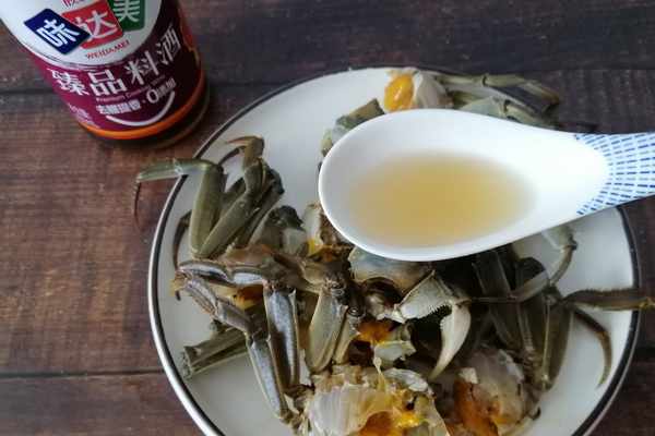 切好的螃蟹倒入一勺料酒醃制一下去腥。