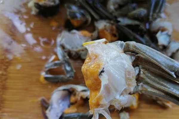 螃蟹清洗乾淨,然後把蓋子和殼都去掉,把螃蟹的肺和腮也都去掉,大鉗子上的絨毛也切掉。