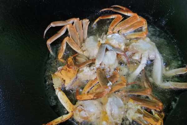 鍋裏倒入油,燒熱之後,把螃蟹放進去,小火炸至表面金黃,我一般是炸熟了,因為後邊炒的時候很快,入一下味就可以。