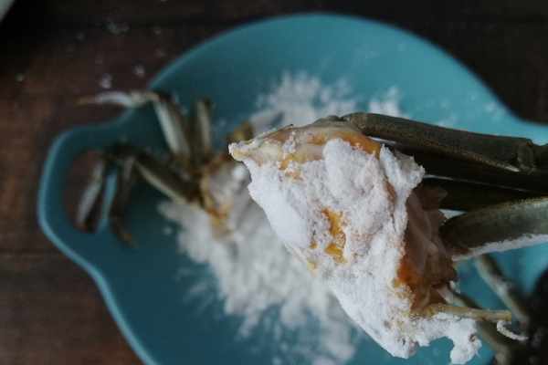 接下來炸螃蟹,把螃蟹的切面蘸上點澱粉,這樣可以鎖住裡邊的肉和蟹黃炸的時候不會跑出來。