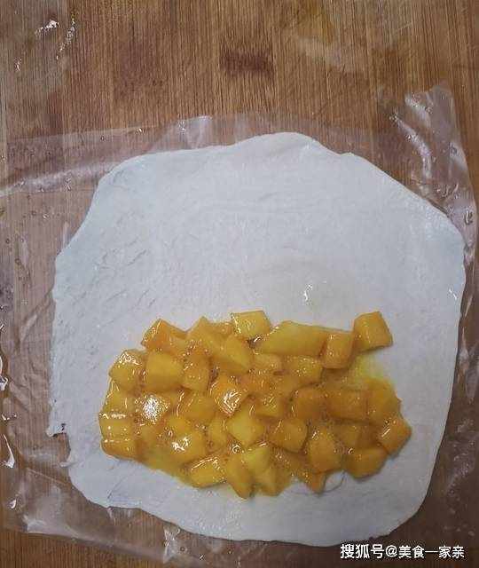 3.將芒果餡鋪到飛餅皮上,隻鋪一半