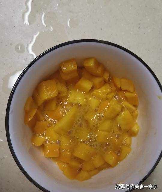 2.芒果去皮切丁,加入少量雞蛋,攪拌均勻