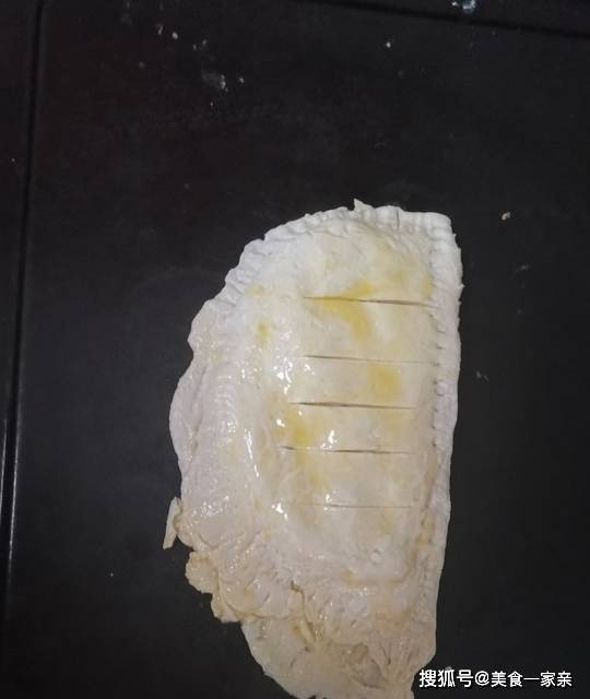 4.將另一半飛餅皮蓋上來,壓實邊緣封口,用叉子劃一些花紋,用刀在餅上劃幾個口,表面塗上蛋液