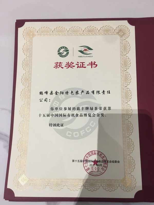 雲上恩施報道(鶴峰通聯記者 劉昌本 通訊員 周琦 孟祥生)4月2日,第十五屆中國國際有機食品博覽會在合肥落幕,鶴峰縣參展的鶴峰縣金陽特色農產品有限責任公司有機綠茶產品獲得金獎。