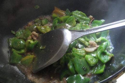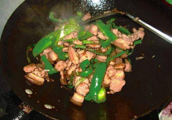 第二步是把選定的辣椒切成小塊。切菜後記得再洗一次。這是為瞭除掉種子。否則,當你再次炒菜時,胡椒籽會變黑,看起來和味道都不太好。第三步是開始做飯。首先,把肥肉放進鍋裡,煎炸大約一到兩分鐘後,它就會把油漬去掉。再往鍋裡放一點蒜粉,使它香味四溢。下一步是將醃制好的瘦肉放入鍋中,然後用大火炒至肉熟後再出鍋。