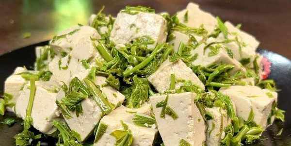 1、香椿清洗幹凈。一塊老豆腐改成小塊。鍋中水燒開,加入一些食鹽,下入豆腐焯燙三分鐘左右,然後將它撈出,放入盤中自然晾涼。