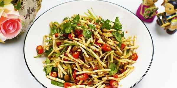 2、出水的魚腥草,加入清水再清洗一遍,控幹水分,倒入盆中,放入黃瓜絲、蔥絲,香菜,花生米,倒入調好的料汁攪拌均勻,一道香辣脆爽、下酒下飯的涼拌魚腥草就做好瞭。