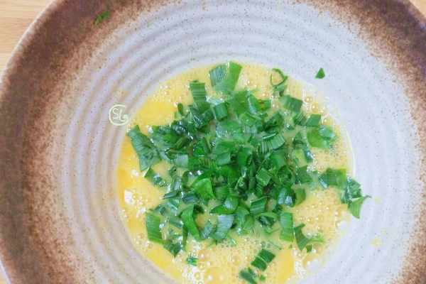 第1步,我們先在碗中磕入三個雞蛋,把雞蛋充分的打散,然後再切點蔥花,切的碎一點,放進雞蛋液中,加入適量的食鹽,充分的攪打均勻。