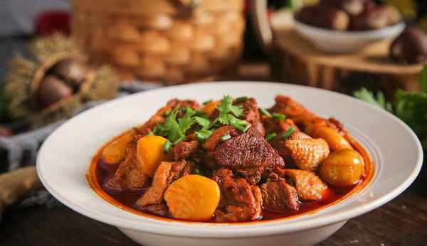 制法:1、白條雞洗凈,剁成3厘米見方的塊,放置在盆中加入醬油、料酒、食鹽,拌勻醃20分鐘,再加入濕淀粉攪勻。用刀在板栗外皮上劃十字形刀紋,投入沸水中煮熟,撈出剝去外皮和裡面的薄皮備用。