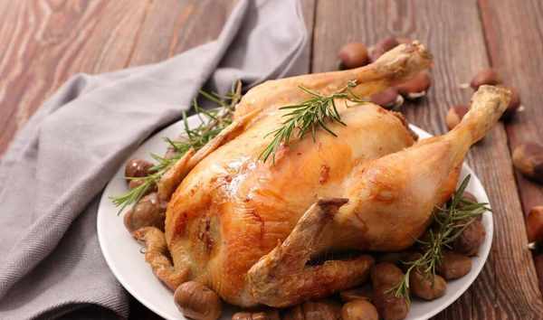 4、鍋坐火上將蒸雞碗內的原汁潷入鍋內,雞塊翻扣在湯盤裡。鍋內湯燒開,放入味精、水木耳,和菠菜後用濕淀粉勾流水芡,將芝麻油淋在雞塊上,板栗整齊地擺放在雞塊上即成。