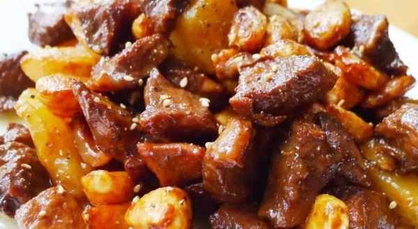 秘制法:1.先將蒜子肉炸熟,撈起。燒鍋下油,待油燒至三成熟時,放入牛肉,拉油至剛熟,倒在漏勺裡,濾去多餘水分和油分。