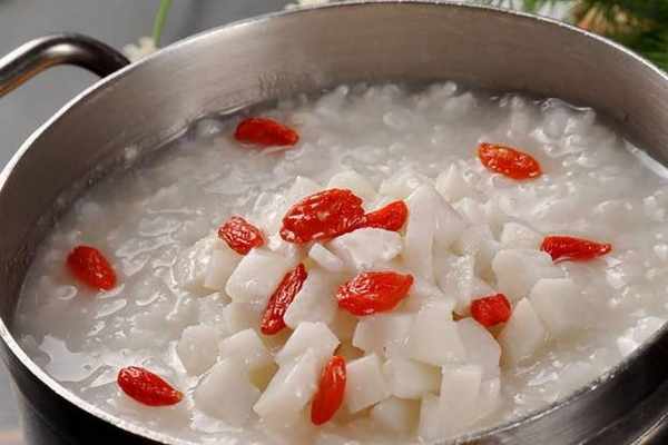 做法:準備鐵棍山藥一根,洗幹凈去皮,切成小段,直接放入湯鍋或者砂鍋中,除此以外,還要加入枸杞一把、糯米半勺、大米半勺、冰糖一把,如果傢裡有大棗的話,最好加入一把大棗,女士吃瞭可以補血補鐵,效果特別好。
