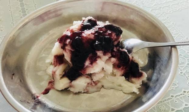 最後一種是小朋友最愛吃的藍莓山藥泥,將面山藥蒸熟,放在碗中壓成泥,壓好以後,放入藍莓果醬,(如果藍莓果醬有點稠,可以加入牛奶稀釋一下,倒在山藥泥上面,效果很好)