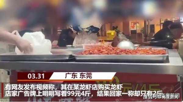 有網友發佈視頻稱,其在東莞某龍蝦店購買龍蝦,店傢廣告牌上明明寫著99元4斤龍蝦,結果回傢一稱卻隻有2斤。4月1日,事發店鋪工作人員回應極目新聞記者稱,“4斤”是為4斤指生蝦,“4斤生蝦確實隻能做出2斤多熟蝦”,最後其將錢退給瞭顧客。