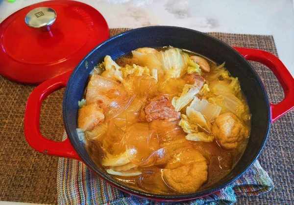 食材:白菜、五花肉、寬粉、桃園建民西瓜醬、蔥薑、幹紅辣椒、油面筋、醬油、蠔油、胡椒粉、白糖、鹽