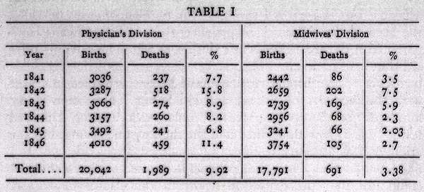 囙此,產科的醫學生經常是先去解剖室解剖前一天死亡的產婦,然後再去產房為產婦接生。在第一產房成為產科教學組織的那一年,它的產褥熱死亡率也直線上升。
