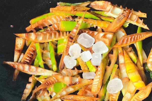 5、煸炒至筍尖斷生變色就可以放調料瞭:先倒1勺料酒從鍋邊淋入,烹出酒香味兒,再放生抽和老抽調味上色,最後丟幾塊兒冰糖下鍋煸炒至融化。