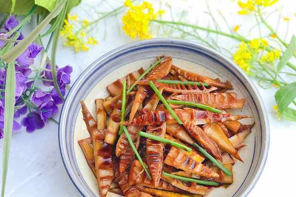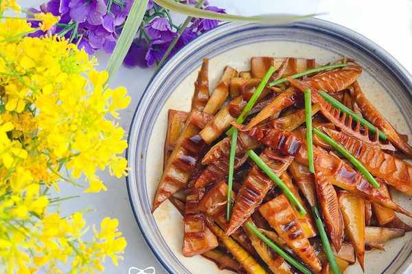 2、新鮮的春筍口感鮮嫩,營養豐富,不需要復雜的調料和烹飪方式,吃的就是一口春天特有的鮮嫩滋味,簡單搭配小蔥就很美味。烹入少許料酒搭配冰糖燜出來的春筍更有江南鮮甜的口感。