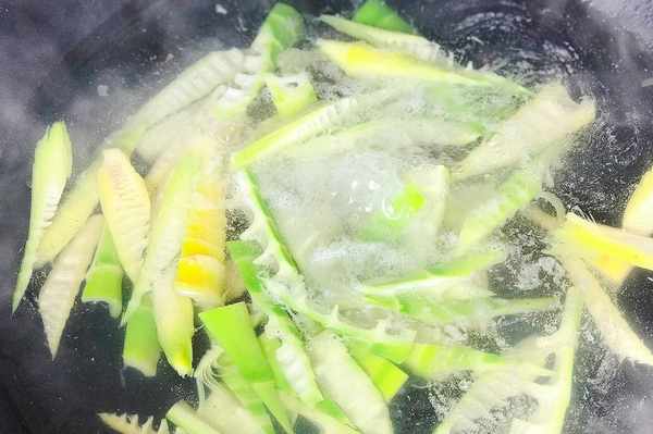 4、焯水後的筍尖撈出放入冷水中浸泡一會兒,炒鍋倒入適量食用油後大火燒至油溫7成熱,先下入蔥段爆出香味兒,再將筍尖下鍋煸炒。今天這道油燜春筍沒有肉,所以不需要蔥薑蒜和辣椒這些重口味的調味料。