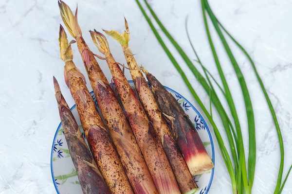 2、將春筍用刀劃一條穿透筍衣的豎線,然後剝掉春筍灰褐色的外衣,保留嫩黃色的筍肉,用清水沖洗幹凈後斜刀切成筍尖。小蔥掐掉根須和老葉子後切成寸長的蔥段,蔥白用來炒筍,蔥葉出鍋裝盤做點綴,準備適量冰糖備用。
