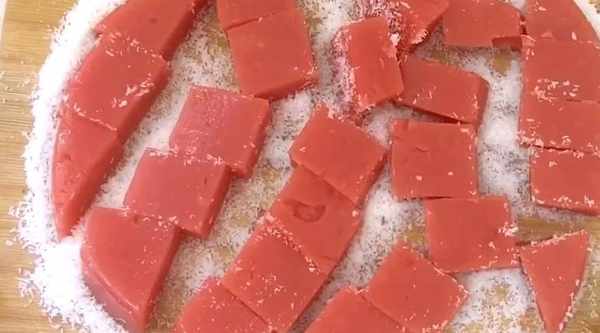 番茄汁煮至濃稠後,即可從鍋中取出。準備一個淺碗,然後取碗中濃稠的番茄汁,冷卻後撈出切成小塊,然後裹上椰絲。美味的番茄蛋糕就做好瞭。酸酸甜甜的味道超級好吃。鄰居們願意花錢買它。你吃過番茄派嗎?
