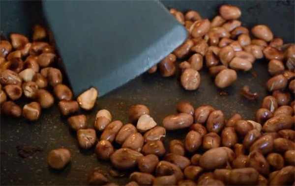 2.鍋裡面不用放油,直接倒花生,全程開小火炒,炒到像這樣有噼啪聲,而且還上色瞭,就說明花生已經炒熟瞭,盛出來放涼。