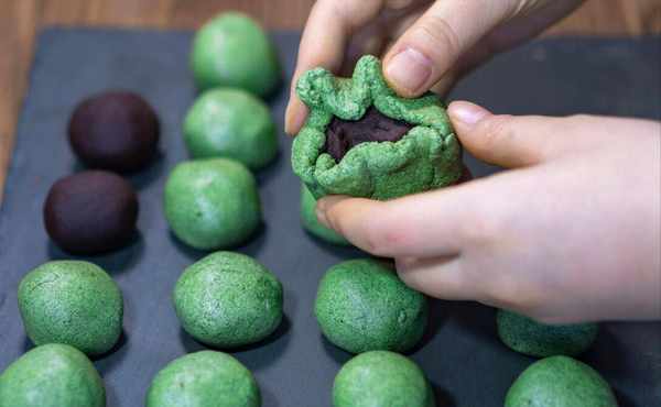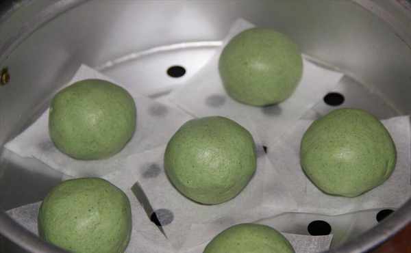 4、混合好後的面團,分成數個劑子,每一個都搓圓,接著再準備適量的紅豆沙,或者其他自己喜歡的餡料,也團成小球,將其裹到面團中,包起來。鍋中添水,水開之後,再把青團放上去蒸,大火蒸15分鐘。