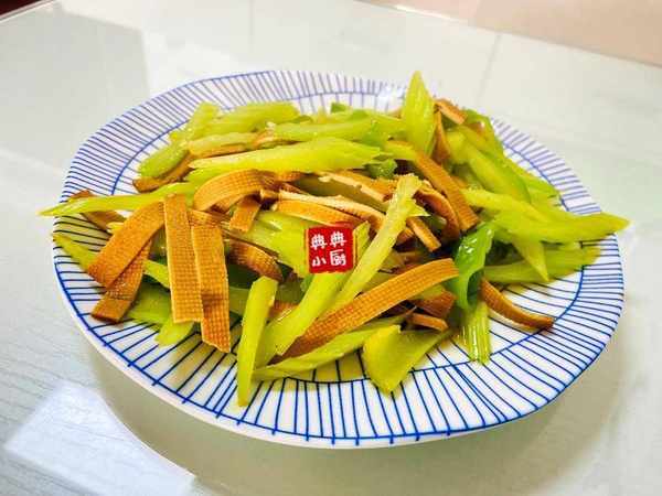 西芹炒香幹。起油鍋,先放西芹炒至斷生,把香幹倒進去,加一點清水,把青椒倒進去,炒均勻之後加一點鹽提味就可以瞭。