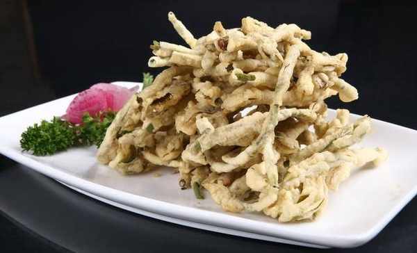 ③、起鍋多倒入一些食用油,油熱下入裹滿面糊的香椿芽,炸至金黃酥脆,撈出控油裝盤即可。