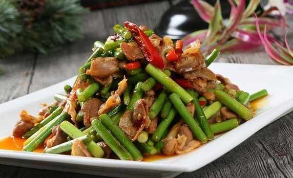 食材:蒜苔半斤,豬肉半斤,辣椒少量,生薑少量。