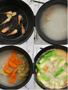 5. 蝦頭變色後,加水煮至湯變成奶白色。