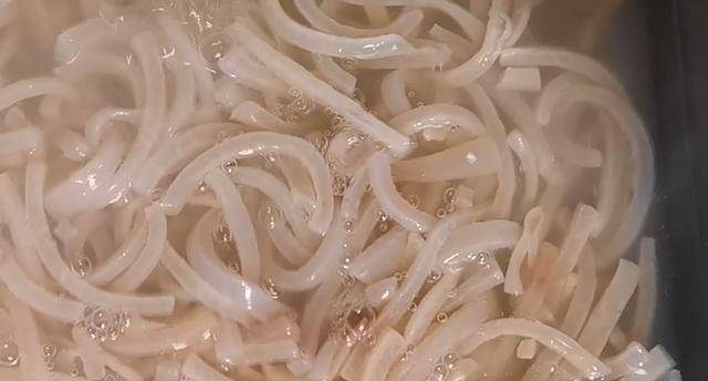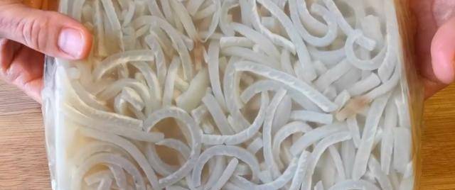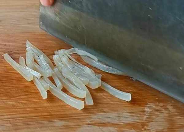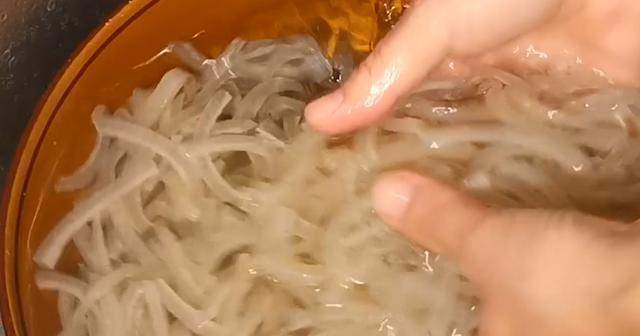三。加入白酒揉搓2分鐘,加鹽6克揉搓2分鐘,加入1/3杯面粉揉搓2分鐘,可以更好地達到除臭除臭的效果,成品也可以晶瑩剔透,然後用熱水洗幾遍,直到水清澈為止,這也是關鍵步驟