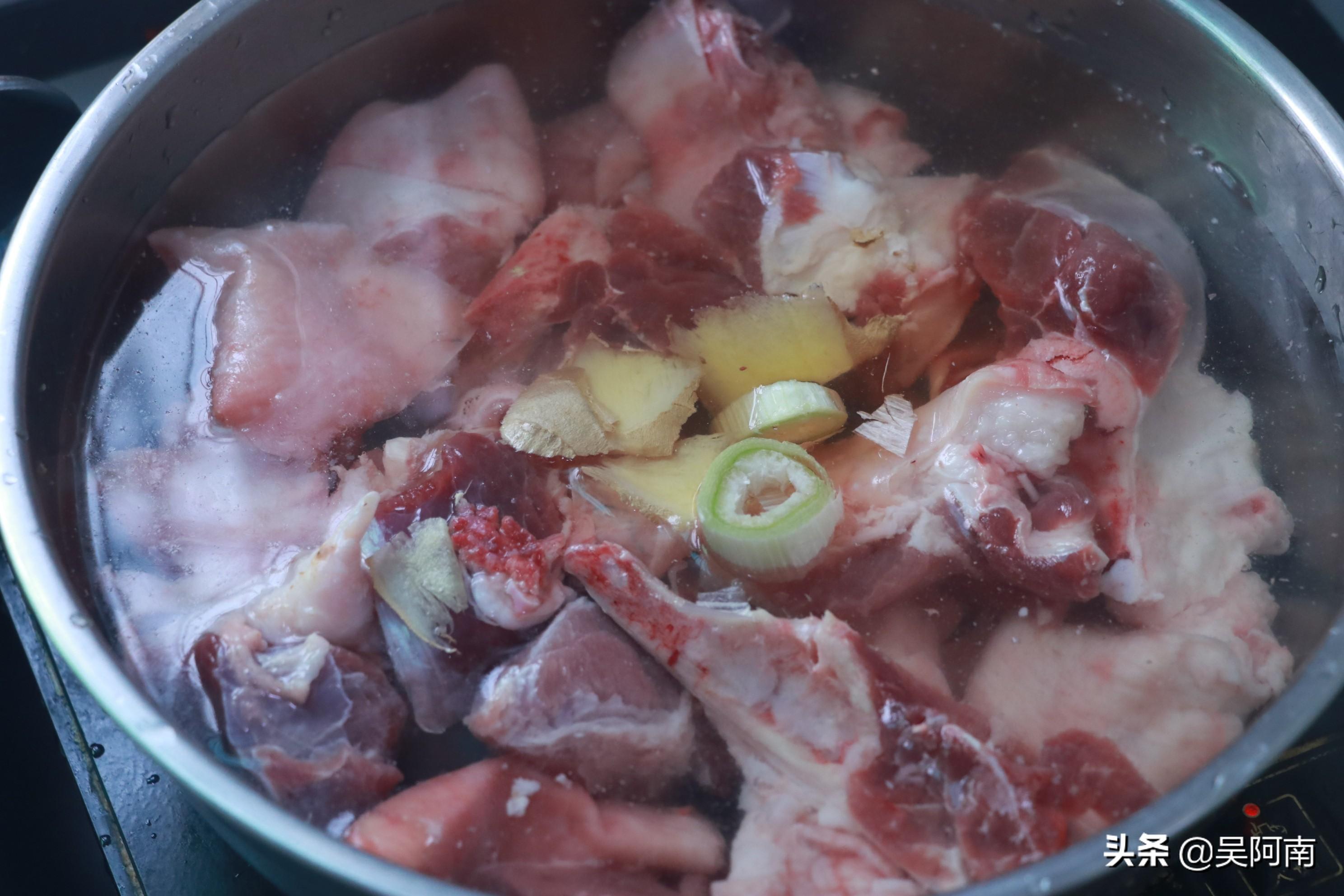將處理過的豬蹄在自來水下沖洗幾次,尤其是要沖洗掉許多骨頭殘渣和粘液。將冷水放入鍋中,加入足夠的水、蔥和生薑料酒,煮沸。烹飪時翻幾次,因為有些鍋可能會粘在鍋上,鍋底很容易燒焦
