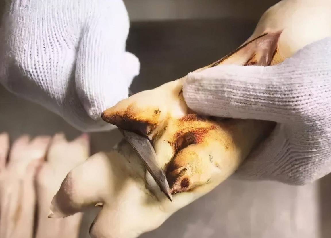 1、豬腳(選用公豬後蹄)用高壓針筒充水至腳趾張開,用火燎去餘毛,刮洗幹凈,縱向一分為二,每一半再橫向砍一刀,不要砍斷,下刀深度約為原料二分之一,放入清水中浸泡20分鐘,然後反復清洗四遍,待水清澈時撈出入沸水焯三遍,每次焯煮的時間約1分鐘,最後入清水浸泡後入清水浸泡30分鐘,瀝幹留用。