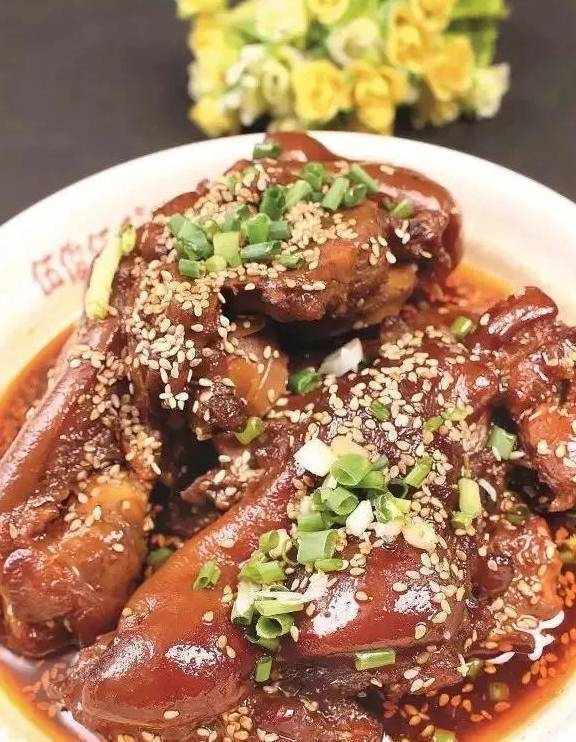 2、鍋入底油晃勻,然後倒掉,下入白糖小火加熱,用手勺推著糖在鍋內朝同一個方向攪至融化,鍋內的糖液先是冒小黃泡,繼而變成金黃色大泡,待糖液炒成雞血紅時迅速下入改好刀的豬腳,翻炒均勻,倒入高壓鍋,添熬好的湘式豬腳鹵水(高度以剛剛沒過原料為準),上汽後壓12分鐘(冬季延長至15分鐘),關火燜3分鐘,撿出豬腳盛盤,點綴熟芝麻和蔥花即可。